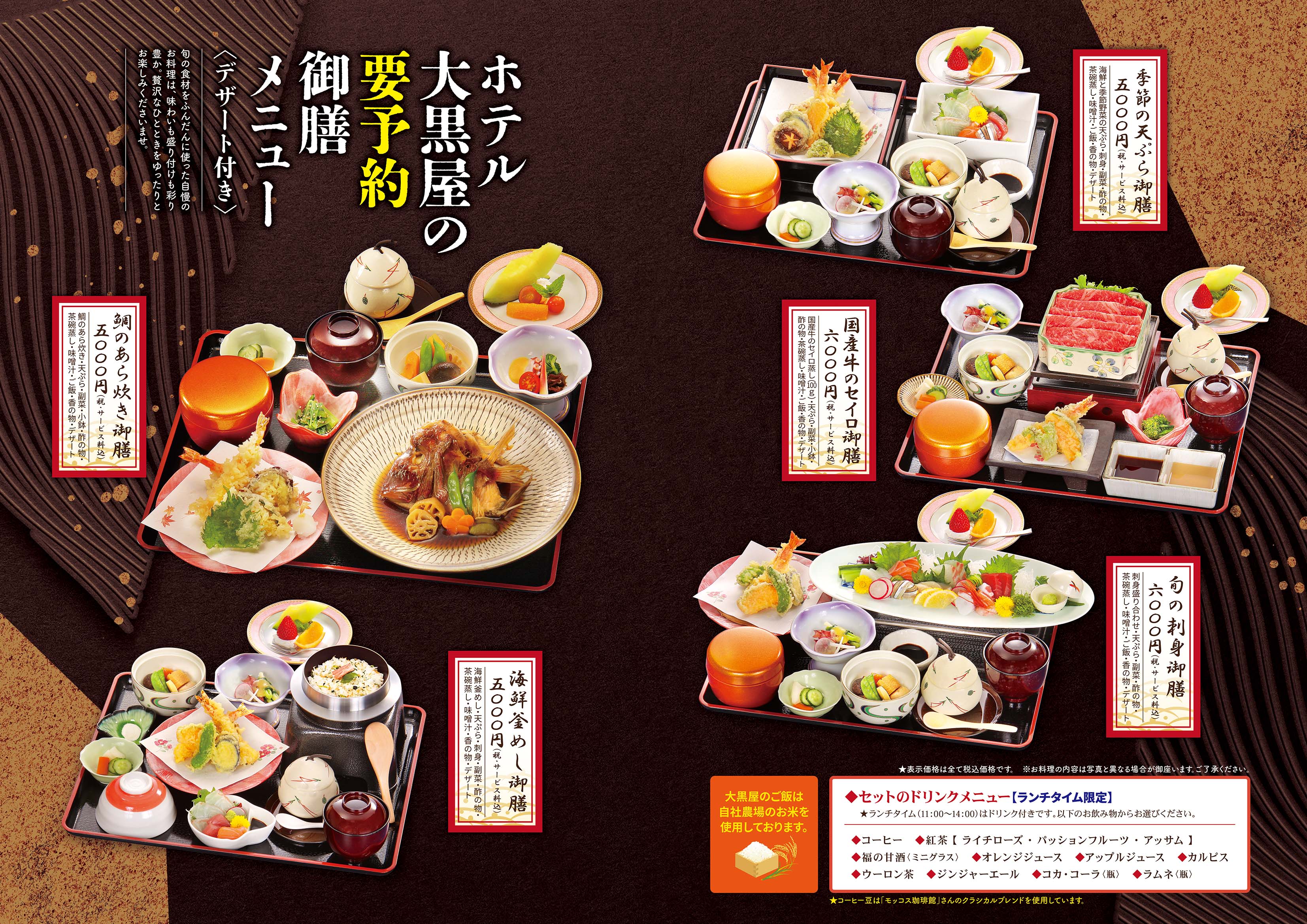 ホテル大黒屋2階にある「和食レストラン 御膳 井な穂」は、明るい和の雰囲気が自慢の和食レストランです。料理人が腕によりをかけた美しくおいしいお料理をお召し上がり頂けます。要予約制となっておりますので、お気軽にお電話にてお問い合わせくださいませ。
